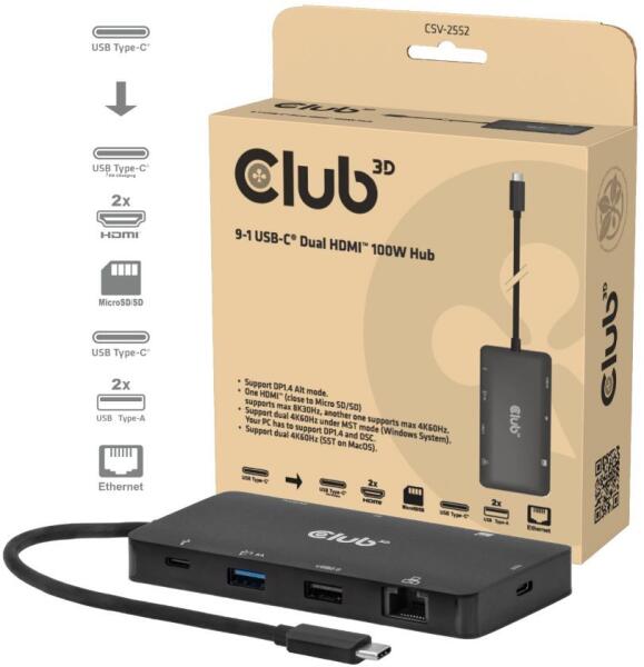 A Club 3D CSV-2552 egy USB-C® 9-1 hub dupla HDMI, 2x USB-A, 1x USB-C® adat, RJ45, Micro SD/SD kártyanyílásokkal és USB-C® töltőhüvely porttal, amely ideális megoldást kínál az USB-C® vagy Thunderbolt gazdagép (PC/laptop/mobiltelefon stb. ) portjának bővítésére, különösen azoknak a gazdagépeknek, amelyek egyetlen USB-C® porttal rendelkeznek.