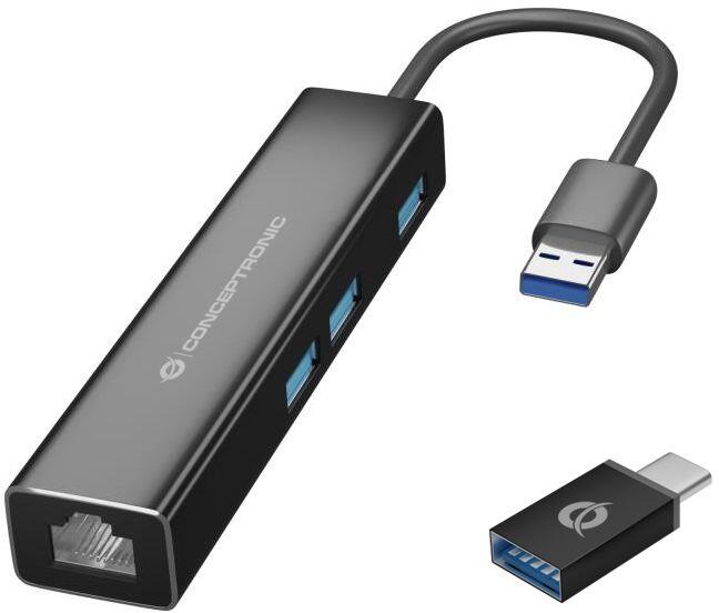 A Conceptronic USB Hub és Gigabit Ethernet Combo Adapter segítségével könnyedén csatlakozhat az internethez a laptop beépített USB-portján keresztül. Ez ideális megoldás MacBook vagy más Windows számítógépekhez, amelyek beépített vezeték nélküli hálózattal rendelkeznek, de nem rendelkeznek Ethernet-porttal. Az adapter egy hagyományos USB-elosztót is kombinál. Így csatlakoztathat külső USB-perifériákat, például MP3-lejátszót, digitális fényképezőgépet, nyomtatót vagy pendrive-ot. Az USB-C – USB-A konverter kényelmes adatszinkronizálást és töltést biztosít bármely USB-C-eszközhöz, például okostelefonhoz, hordozható játékkonzolhoz, MacBookhoz, Chromebook Pixelhez vagy bármely hasonló, USB-C porttal rendelkező, késői modellhez tartozó laptophoz. 10/100/1000Mbps vezetékes sebességű átvitel és vétel USB 3.0 SuperSpeed (5 Gb/s) Beépített Wake-on-LAN funkció a számítógépek távoli indításához Többplatformos támogatás: Windows, Mac OS, Chrome OS Egyszerű Plug and Play telepítés Alumínium burkolat a hőelvezetéshez