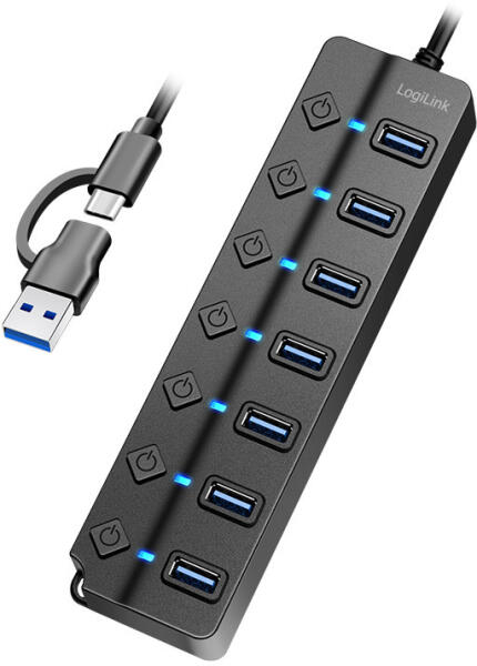 LogiLink USB 3.2 Gen1 Hub, 7 Port, Be-/kikapcsoló, Fekete - fizz
