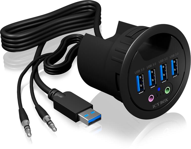 RaidSonic IcyBox USB 3.0 Asztali Hub - 4 Port + 1x Audio input + 1x Audio output, Fekete
