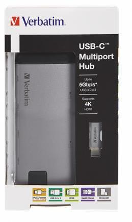Verbatim USB elosztó-HUB és ethernet átalakító, SD kártya olvasó, 4 port, USB 3.0, USB-C, HDMI, VERBATIM