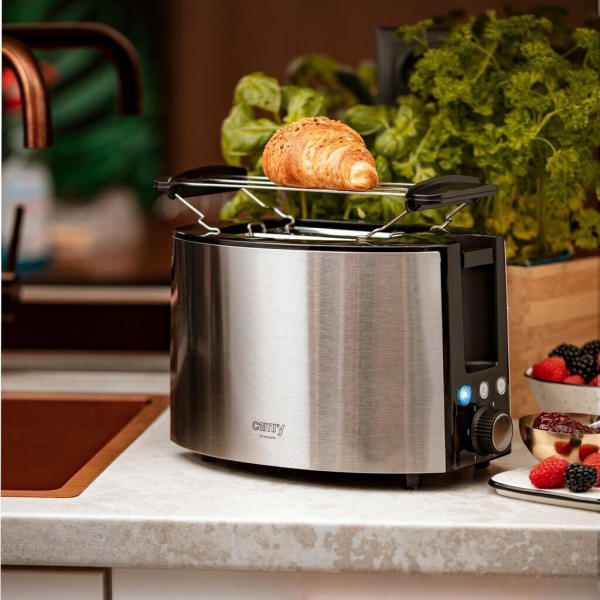 Reggeli királyai: Szereti a meleg reggeliket? A ropogós pirítóst vacsorára? Vagy talán egy ízletes, ropogós kiegészítőt keres a kedvenc salátájához? A CR 3215 kenyérpirító mindenki számára tökéletes választás, aki szereti a lekváros pirítóst vagy a meleg zsemlét reggelire. Egy stílusos készülék, amely funkcionalitásával és megjelenésével is lenyűgözi, és minden konyhában jól mutat! Pár perc alatt meglepheti családját a meleg kenyér illatával, amely gazdagítja az étkezéseket! A termék magas minősége hosszú éveken át biztosítja az élvezetet! A legfinomabb ropogós pirítósok: Az 850W teljesítményű kenyérpirítóval gyorsan elkészítheti kedvenc kenyérét, amelyet néhány perc alatt melegíthet és piríthat meg. A sima pirítási szabályozásnak köszönhetően minden családtag kiválaszthatja a számára ideális pirítási fokozatot. Ráadásul a kenyérpirító kihúzható morzsatálcával rendelkezik, amely segít gyorsan és kényelmesen rendet tartani a konyhában. Talán ma este gofrit készít vacsorára?❄️ Melegítés és kiolvasztás: A kenyérpirító legnagyobb előnye, hogy kiolvasztásra is használható! Ez segít megőrizni az élelmiszereket és időt spórolni a konyhában. Csak használja a kiolvasztó funkciót, és néhány perc múlva élvezheti a frissen sült kenyérhez hasonló ízt! A kenyér megfelelő pirulása után a készülék automatikusan kikapcsol. Ha azonban észreveszi, hogy a kenyér már tökéletes, használhatja a STOP gombot, amely azonnal kikapcsolja a kenyérpirítót. Jó étvágyat!