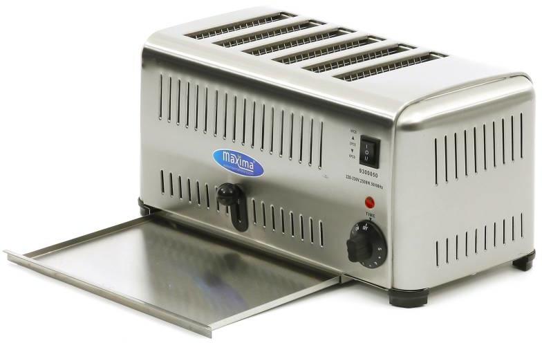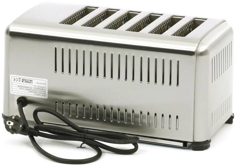 Egy finom reggelihez, ízletes ebédhez vagy villásreggelihez készítsen pirítóst ezzel a professzionális kenyérpirítóval. Lekerekített sarkaival ez a kenyérpirító szemet gyönyörködtető éttermében, kávézójában, szállodájában vagy egyéb vendéglátó helyén. A készülék nagy teljesítményű, így a kenyerek gyorsan megpirulnak. Egyszerre a kenyérpirító 6 szelet kenyér pirítására alkalmas. Ez hasznos, ha egyszerre nagyobb mennyiségű pirítóst szeretne készíteni. A vendégek gyorsan meg is piríthatják saját kenyerüket, ha a kenyérpirítót önkiszolgáló készülékként használják. A kenyérpirító a vezérlőjének köszönhetően lehetővé teszi, hogy az összes kenyérpirító állást vagy csak néhányat üzemeltessen kedve szerint. A kenyérpirító időzítővel is rendelkezik, így nem kell a gép mellett megvárnia, amíg a pirítós elkészül. Ha korábban szeretné kivenni a kenyérszeleteket a kenyérpirítóból, használhatja a gép oldalán lévő emelőkart. A hőmérsékletjelző lámpa mutatja, ha a kenyérpirító elérte a megfelelő hőmérsékletet. Ekkor lehet a kenyérszeleteket a nyílásokba tenni. A kenyérpirító morzsatálcával is fel van szerelve. A morzsatálca kivehető, így könnyen tisztítható. A ház rozsdamentes acélból készült, és könnyen tisztítható nedves ruhával, meleg vízzel és kevés enyhe mosószerrel. Tisztítás után törölje szárazra a kenyérpirítót, hogy ne maradjanak csíkok a rozsdamentes acélon. A kenyérpirító négy gumilábon áll, így használat közben nem csúszik el.