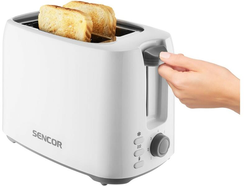 A Sencor STS 2606WH kenyérpirító praktikus funkciókkal rendelkezik, mint például a kenyér automatikus középre történő igazítása, amely lehetővé teszi a kenyér vastagságának kiválasztását. Ezenkívül képes automatikusan kiolvasztani, majd egyetlen folyamattan befejezni a fagyasztott péksütemények sütését. Praktikus a High Lift funkció, a pirítókosár úgynevezett magas emelése, amely biztosítja a még kisebb kenyérszeletek pirítását és egyben megkönnyíti a maradék részek eltávolítását.