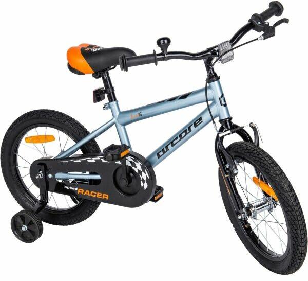 Arcore JIMMY 16 gyerek kerékpár 16-os kerekekkel, alacsonyabb vázzal és magasabb kormánnyal. Az első kerék Alu V-fékkel, a hátsó pedig kontrafékkel van ellátva. 3-6 éves, 100-125 cm magas gyerekeknek tervezték.