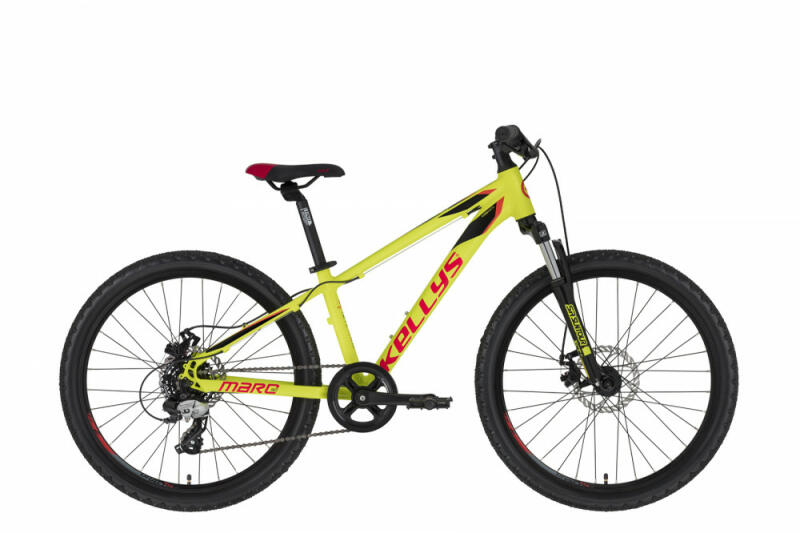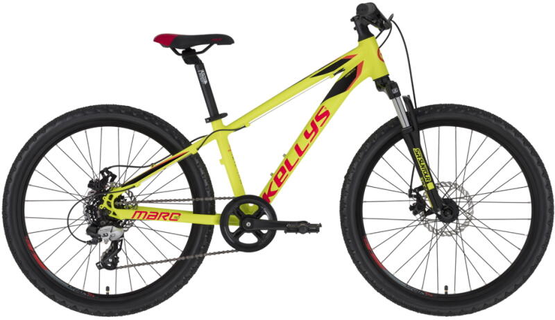 A KELLYS MARC 50 24" - modell 2022 junior kerékpár egy modern junior hegyikerékpár könnyített 12,5" vázzal és 24" kerekekkel. A kerékpár lágy rugózású Suntour villával 50 mm rugóúttal, hétfokozatú hátsó váltóval, megbízható, nehezebb terepre is alkalmas gumiköpenyekkel és C-Star tárcsafékekkel van felszerelve. A Kellys Marc 50 junior kerékpár designjával határozottan felkelti a figyelmet - a sárga színt a piros és fekete kiegészítőkkel nem lehet nem észre venni. Köszönhetően vázának és...