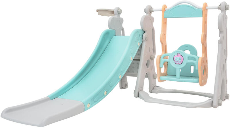A zsiráf formájú 3 az 1-ben csúszda és hinta egy multifunkcionális készlet, amely órákig tartó biztonságos és aktív játékot biztosít gyermekének – beltéren és kültéren egyaránt. A készlet 1 éves kortól ajánlott, és három attrakciót egyesít – csúszdát, hintát és kosárlabdapalánkot. Az egész szerkezet kiváló minőségű HDPE-ből készült – rendkívül tartós, rugalmas és sérülésálló anyagból, amely még intenzív használatnak is ellenáll. A nagy és masszív alkatrészek stabilitást és egyszerű összeszerelést garantálnak, a készlet maximális terhelhetősége pedig 100 kg. A készlet tartalmaz egy széles, kényelmes, magas háttámlával és levehető korláttal ellátott hintát a legkisebbek biztonsága érdekében. Az erős hintaívek javítják a stabilitást hintázás közben, a masszív platform pedig tovább erősíti az egész szerkezetet. A stabil csúszda 160 cm hosszú, ami még a legkisebb gyerekeknek is elég izgalmat nyújt. A csúszda tartós, kétrétegű műanyagból készült, amely biztosítja a stabilitást. A csúszdához való hozzáférést három biztonságos, széles lépcső biztosítja, oldalt pedig további kapaszkodók találhatók. A játszótér további attrakciója egy kosárlabdapalánk és egy kis gumilabda, amelyet a kisgyermekek is biztonságosan dobálhatnak. A gyerekek figyelmét biztosan felkelti a levehető alma alakú, hangokkal és háromszínű világítással rendelkező játék. Az alma állatok hangjait és nevét, dallamokat és utasításokat játszik le angol nyelven.