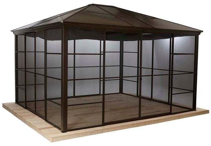 Az alumínium kerti pavilon praktikus és elegáns megoldás baráti társaságban való üldögéléshez és pihenéshez. Méretek: 427×362×296 cm. Szín: bronz. A pavilon üvegezés nélkül készült. Egész évben használható. Az ablakok üvegbetét nélküliek. A pavilon kiegészítőit itt találja.
