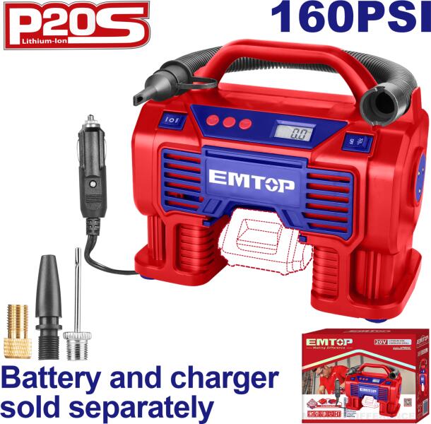 Feszültség: 20V Maximális nyomás: 160PSi/11BAR 3 db LED-del Digitális képernyő Automatikus kikapcsolás a megadott nyomáson Járművel vagy lítium-ion akkumulátorral működik 3M kábellel öngyújtóval 1 db golyós adapterrel 1 db gumiabroncs-völgy adapterrel 1 db légágy adapterrel Az akkumulátor és a töltő külön vásárolható meg Színes dobozba csomagolva