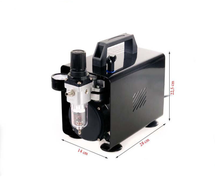 Elegáns fémlemezes borítású airbrush kompresszor, levegőszabályzóval ellátva. A nyomás pontás beállítása és az alacsony zajkibocsátás garantálják a problémamentes működést a bel- és kültéri munkáknál is. Ideális az otthoni munkákhoz, de a könnyű professzionális felhasználáshoz is. A hőbiztosítónak, az AutoStart és AutoStop funkcióknak köszönhetően a kompresszor nem hevül fel és problémamentesen működik.