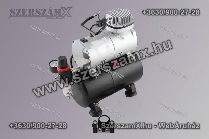 Muszaki leírás:-típusa: egy hengeres, dugattyús, olaj-mentes kompresszor-teljesítmény: 150W-Fordulatszám: 1700 ford/perc-feszültség: 220V-50Hz-automatikus bekapcsolás: 3 Bar -nál-automatikus kikapcsolás: 4 Bar -nál-levego szállítás: 20-23 liter/perc-tömege: 5kg-méretek: 310x135x310 (mm)-tartályos-nyomás szabályzó reduktorra