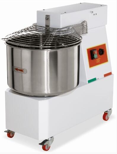 Festett acélházzal, rozsdamentes acél üsttel, rozsdamentes spirális dagasztókarral, időzítővel, biztonsági kapcsolós védőráccsal, kerékkel. Űrtartalom: 25 kg/ 32 liter 2 Sebességes Üst méret: Ø400mm Kapacitás: ~88 kg/óra Teljesítmény: 1,1 kW/400V-3N~ Mérete: 424x735x805 mm