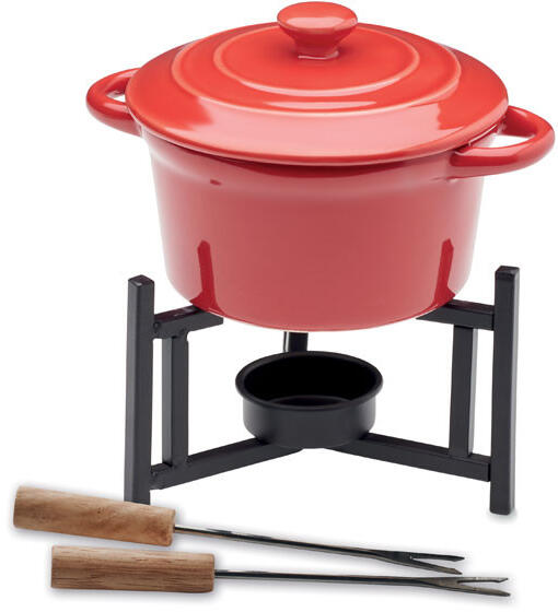 Kis fedeles kerámia fondü készlet két személyre. Két fanyelű fém villát tartalmaz. Teamécses nélkül szállítjuk. Űrtartalom: 300 ml.