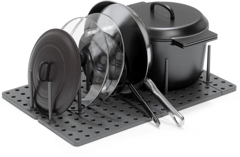 Az Umbra márka Peggy fedél- és serpenyőtartó állványa tökéletesen alkalmazkodik a tárolt edényekhez . A csúszásmentes alapon összesen 108 lyuk található, amelyekbe tetszés szerint helyezheted el a tizenhat mellékelt kis tartópálcicákat.