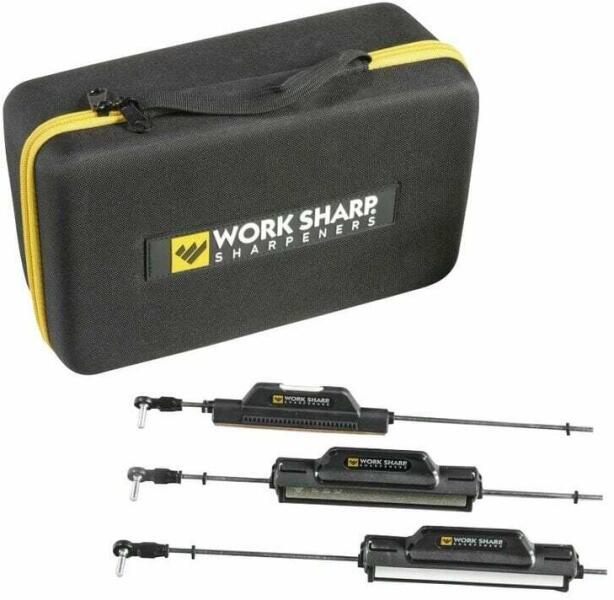 3 oldalú durva szemcsés blokk 220, 320 és 400 szemcsés gyémántbetétekkel - ideális javításhoz és új vágóél létrehozásához, 3 oldalú finom szemcsés blokk 2 darab 600 és 800 szemcsés gyémántlemezzel és egy finom kerámiakővel - a megfelelő élezéshez, bőrszíjjal és kerek kerámiakővel ellátott blokk - a penge végső simításához (élezéshez) és a fogazott él élezéséhez. egy erős hordtáska, amelyben nemcsak a csiszolóblokkokat, hanem a Work Sharp Precision Adjust csiszológépet is tárolhatjuk. A késcsiszoló nem tartozék.