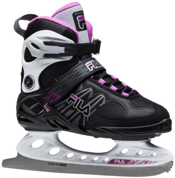 Női korcsolya - Szín: kék - fekete Váz anyaga: hidegálló vinil, sima műszőrme Bélés anyaga: nylonszál Középtalp: fröccsöntött műanyag Pengék: rozsdamentes acél Rögzítő rendszer: fűző + csat + tépőzáras pánt