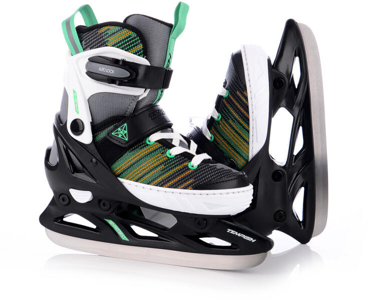 Gyermek jégkorcsolya - Szín: zöld Váz anyaga: PVC - TPU - nejlon Bélés anyaga: cambra nejlonszál Középtalp: fröccsöntött TPU Pengék: szénacél Rögzítő rendszer: fűző + tépőzár + csat Méret beállításának módja: kar Méretbeállítás tartománya: o 3