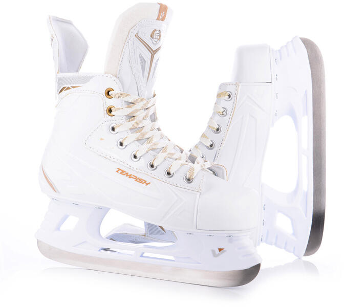 Női korcsolya - Szín: fehér Váz anyaga: kemény kompozit hőre lágyuló műanyag Bélés anyaga: cambra nejlonszál Középtalp: fröccsöntött TPU Pengék: TEMPISH 7000 rozsdamentes acél Rögzítő rendszer: csipkék