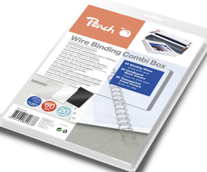 Magasfényű borító 10 db (fehér), 250 g/m2 Magasfényű borító 10 darab (fekete), 250 g/m2 Transzparens elülső borító 20 darab, 0,18 mm-es Kötődrót 20 db (8 mm), ezüst színű