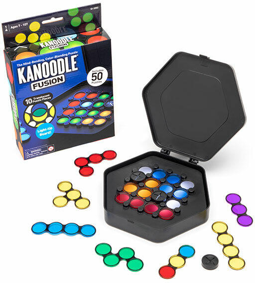A Kanoodle, egyedül játszható logikai játék a szó szoros értelmében színes fordulatot vesz, melyben nem csak a puzzle elemek elhelyezésére, de a színkeverés elveire is oda kell figyelned!Használd a 13 mellékelt puzzle darabot, hogy megold az 50 furmányos feladványt, amit a mellékelt füzetben találsz. Helyezd el a 3 fekete puzzle darabot és a 10 színes átlátszó darabot a világítós puzzle táblán. Játék után a darabok és a puzzle útmutató könnyedén tárolhatók a a játék dobozában.