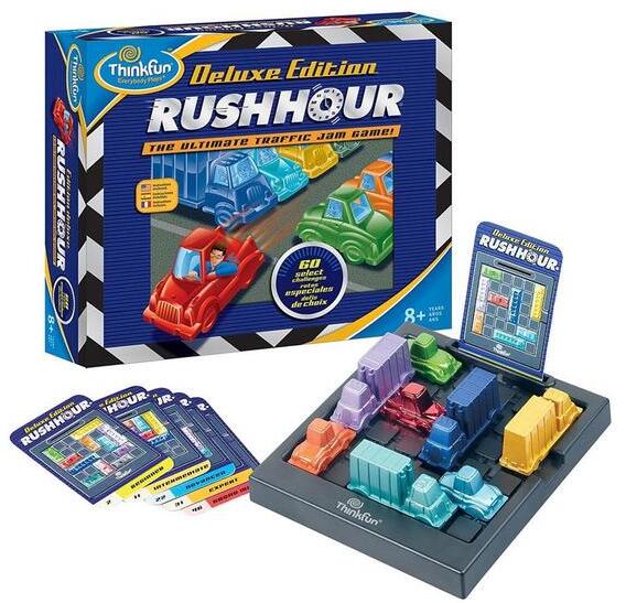 A Thinkfun Rush Hour Deluxe Edition  a csúcsforgalomba csak egy dolog jár az eszünkbe, hogy kiszabaduljunk a dugóból. A Rush Hour logikai játékban is ez a lényeg de itt csak a térlátásunkra és az eszünkre lesz szükség. A játékosnak úgy kell tologatnia az autóit, hogy sikeresen kikerüljön a dudáló autók tömegeiből.  A Rush Hour Deluxe Edition a játék rajongóinak készült, hiszen nem csak 60 vadonatúj feladványt tartalmaz, hanem a készítők a játékelemeket is újratervezték, így egy sokkal elegánsabb játéktér fölé görnyedve törhetjük a fejünket. Ezúttal a feladványok 5 különböző nehézségi fokozatra lettek felosztva, hogy a kezdőktől a legprofibbakig mindenki megtalálja magának azt a szintet, ami kihívást jelent számára, de nem tűnik lehetetlennek a Rush Hour csúcsforgalmi helyzetének megoldása. .