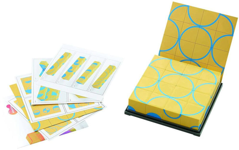 ... számtalan képet készíthet a gyerekeknek. Mindegyik oldalon tömör vagy keretes negyed-/félkör mintázat található kék és sárga színben. A vonalak és területek egyszerű elemei különféle kreatív játékokat építenek fel. A tört tanulása nagyon szórakoztató lehet! Ezekkel a kockákkal a gyerekek élvezhetik a matematikai fogalom elsajátítását, és végtelenül érdekes képeket készíthetnek 2D-től 3D-ig.