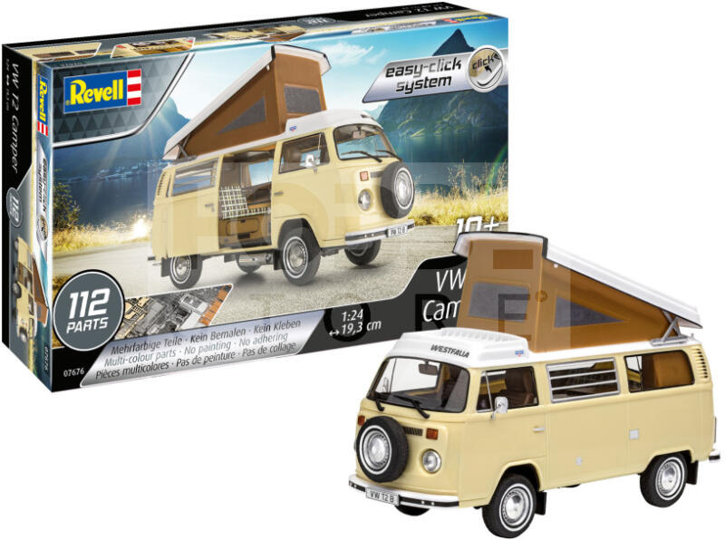 Revell Easy Click VW T2 Camper 1:24 autó makett 07676R Makett méretarány: 1:24 Alkatrész darabszám: 112 Makett hossúság: 19,3 cm Festést igénylő műanyag makett. A szükséges kiegészítőket, mint festék, ragasztó a készlet nem tartalmazza . Gyártó: Revell