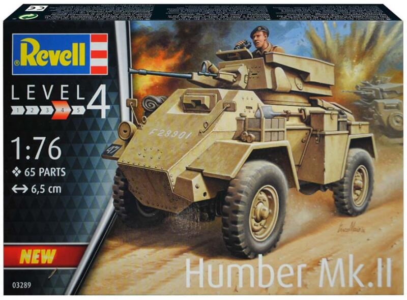 Revell 03289 Humber Mk. II összeragasztós páncélozott jármű modell. Méret: 1:76; 6,5 cm. A csomag tartalma: 65 darab összeragasztandó alkatrész.