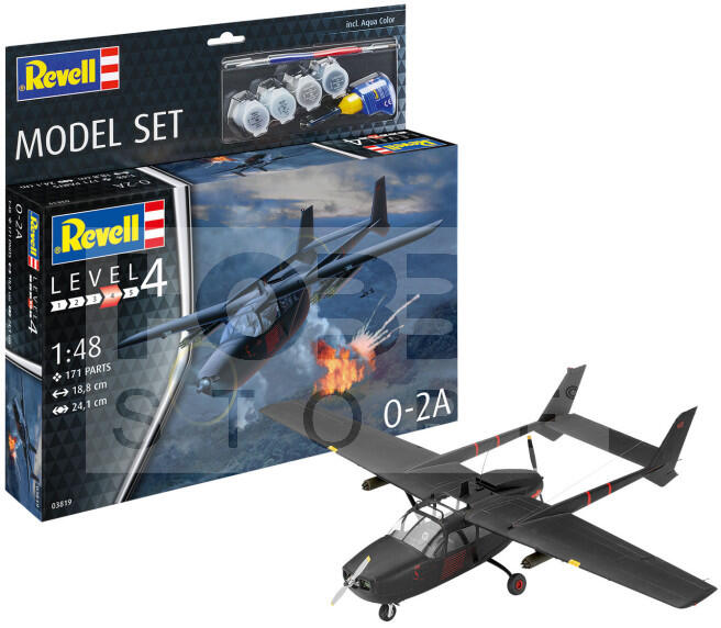 Revell Model Set Set O-2A Skymaster 1:48 repülő makett 63819R Makett méretarány: 1:48 Alkatrész darabszám: 171 Makett hossúság: 18,8 cm Festést és ragasztást igénylő műanyag makett. A készlet az alap színeket (Revell Aqua Color), ragasztót illetve ecsetet tartalmaz . Gyártó: Revell