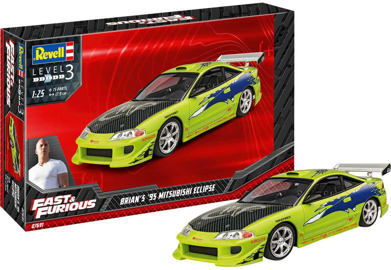 Revell 07691 - Mitsubishi Eclipse 1995 1:25 méretarányú műanyag modell ragasztáshoz. A készlet 75 alkatrészt tartalmaz, hossza 179 mm, nehézségi fok 3. A csomag hiteles matricákat tartalmaz a "The Fast and the Furious" című filmből.