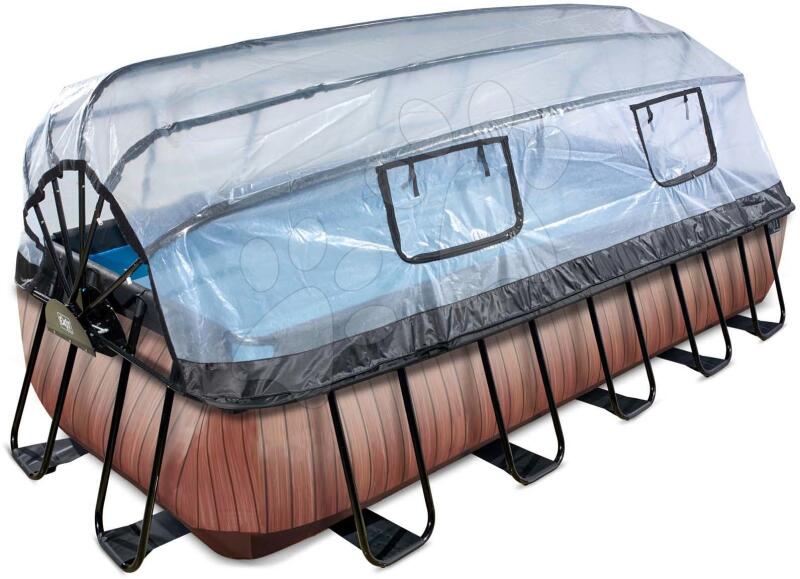 Medence szűrővel Wood pool a holland Exit Toys műhelyéből egy 540*250*100 cm méretekkel rendelkező tágas föld feletti medence, mely kiszolgálja az egész családot a forró nyári napokon. Barna robosztus medence oldalfala famintával minden udvart és kertet még szebbé varázsol, erős acél medencekeret portechnológiával kezelve ellenáll a korróziónak és a kedvezőtlen időjárási viszonyoknak egyaránt. Medence a 14 erős fém lábnak köszönhetően nagyon stabil, szilárdan megáll a helyén. A medencébe létrán keresztül vezet az út, melynek lépcsőfokai csúszásmentesek. A víz tisztaságáról minőségi  homokszűrős vízforgató gondoskodik, mely biztosítja a zavartalan vízáramlást és egyben tisztítja is azt.  A medence áttetsző úszómedence-takaróval is fel van szerelve, amely megakadályozza a víz beszennyeződését, és segít megőrizni a hőmérséklet stabilitását. A kupola alakú takaró egyedi csuklós mechanikával lett kialakítva, melynek köszönhetően igény szerint könnyen nyitható és zárható.  A medence térfogata 12600 liter, a medence belső része kék színű, aminek köszönhetően a víz tiszta és friss benyomást kelt. Medence teljes súlya 190 kg, az úszóterület méretei 510*210 cm, a víz ajánlott mélysége 90 cm. Teljes méretei a medencének a vázzal együtt 610*320 cm, miközben teljes magassága 220 cm. Medencében kényelmesen elfér 9 felnőtt személy, vagy több gyermek 6 éves kortól.  A medence 3-rétegű oldalfala tartós és vastag PVC anyagból   és poliészterből készül, amely hosszú élettartammal büszkélkedik. A csomag tartalmaz oldalfal javítókészletet is. Homok a szűrőbe nem képezi a csomag részét.  Ez a nagyszerű, modern medence bármely kertbe megállja a helyét, a forró nyári napokon a legkellemesebb felfrissülést nyújtja az egész család számára éveken keresztül.  Holland Exit Toys márka már hosszú évek óta halmozza el kicsiket és nagyokat elsőosztályú outdoor termékekkel. Exit Toys termékek megfelelnek a legszigorúbb EU-s normáknak és szabványoknak, TÜV, CE, EN71 tanúsitványokkal rendelkezik. Medencék egyedi holland stilusban pompáznak, a csúcsszuper minőség pedig garancia, hogy a termék éveken keresztül nyújt szórakozást az egész család számára.