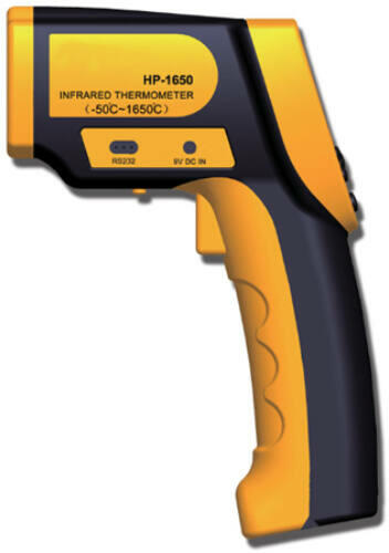 Az infravörös hőmérséklet érzékelés segítségével érintés nélkül mérhető meg szilárd vagy folyékony tárgyak hőmérséklete. A pisztoly alakú kialakítás lehetővé teszi, hogy pontosan az adott terület hőmérsékletét tudjuk megmérni. Lézer célzás a pontosabb mérésért. A mérési eredményeket a jól látható LCD kijelzőről olvashatja le. - Infravörös hőmérsékletérzékelő lencse. - LCD kijelző. - Adattárolás, visszahívás funkció. - Minimális, maximális érték meghatározás. - Átlag és különbség számolás funkció. - Utolsó mért adat kijelzőn tartása. - Mérési válaszidő: 500msec. - Emisszió: 0.1-1.0 (állítható). - Hullámhossz: 8-14um. - Mérési tartomány/pontosság:- -50°C-1650°C / +/-1.5%. - Hőmérséklet kijelzés Celsius vagy Fahrenheit fokban. - Pisztoly alakú kiképzés. - Tápfeszültség: 9VDC 6F22 elemről. - Működési hőmérséklet: 0°C - +40°C. - Működési páratartalom: 10%-95% (nem kicsapódó). - Méretei: 205mm x 143mm x 58mm. - Súlya: 276g. - CE minősítés.