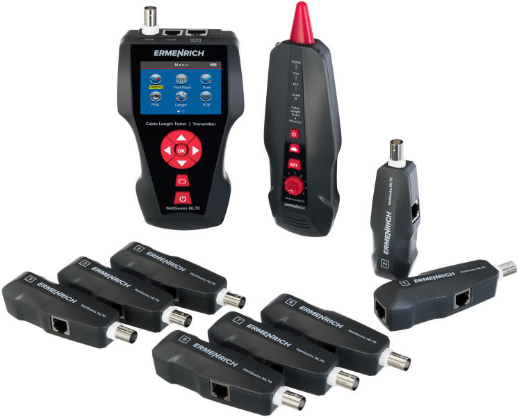 A termékhez 8 távegységet mellékelünk. Funkciók: kábelhosszmérés a kábel kapacitásának a mérése révén, kábeltesztelés, kábelkövetés, port flash funkció, PoE teszt, PING teszt