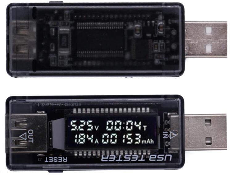 Nagyon kompakt USB tesztelő 4-20V üzemi feszültséggel, feszültség, áram, kapacitás és aktív idő kijelzésével