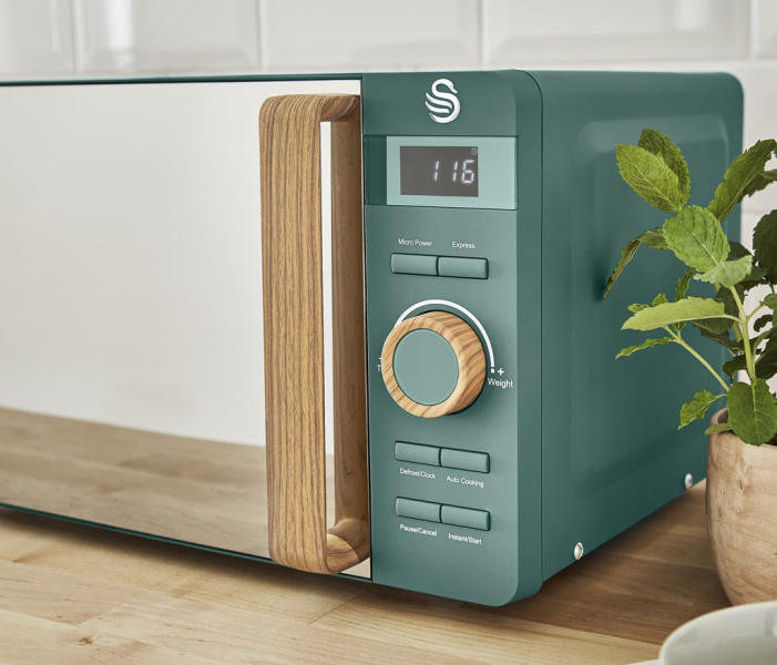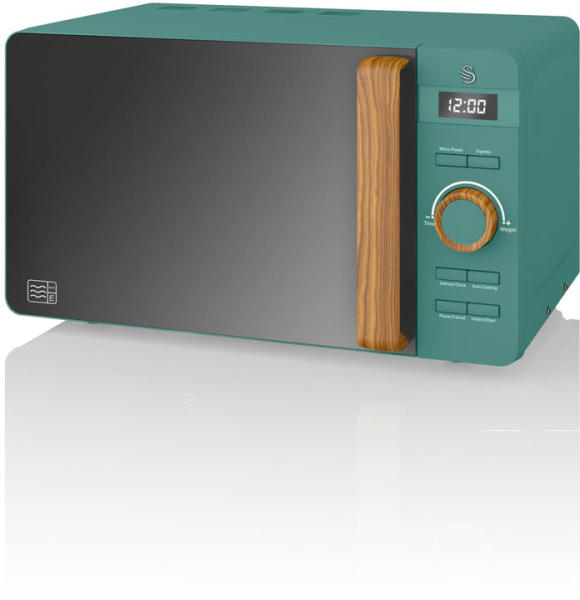 A stílusos Swan Nordic SM22036GREN zöld színű, fahatású fogantyúval és számlappal ellátott, egyedi mikrohullámú sütővel szemet gyönyörködtető kiegészítője lehet konyhájának.