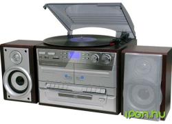 Mini HiFi torony: Lemezjátszó / Magnó / CD játszó és rádió kombó - AM/LW/ FM Radio, - Frekvencia tartomány: LW 520-1600 Khz, FM 87.5-108 Mhz, - Lemezsebesség: 33 / 45 / 78 RPM, - Lemezjátszó tető, - Előltöltős CD játszó, - CD / CD-R / CR-RW / MP3 visszajátszás, - Programozás: CD: 20 szám / MP3:10 szám, - 2 kazettás magnó (felvétel és lejátszás, gyorsmásolás) auto stop funkcióval, - USB csatlakozás, - SD / MMC kártyaolvasó, - Felvétel: (1) bakelitről USB/SDre (2) kazettáról USB / SD kártyára (MP3 32-256 Kbps), - LCD kijelző - ID3 tag támogatással, - Csatlakozások: RCA in, - fejhallgató kimenet, - 2 utas "bass reflex" hangszóró, - Teljesítmény: 2x 4 Watt (RMS), FM antenna, - Tartozék: távirányító és tű, - Tápellátás: AC 230V / 50 Hz, - Méret: kb. 310 x 315 x 145 mm, - Súly: kb. 9.5 kg