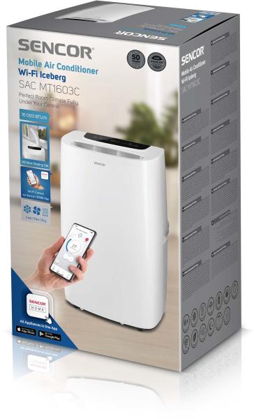 A Sencor SAC MT1603C Wi-Fi Iceberg készülékkel kellemes környezet várja a munkából vagy akár kirándulásból való hazatérés után is. A mobil klímaberendezés 3 különböző módon és intuitív módon üzemeltethető. A hagyományos távirányítós és panelről történő működtetés mellett, mostantól lehetőség van a készülék bárhonnan történő működtetésére is, a mobiltelefonra telepített Sencor HOME alkalmazás segítségével