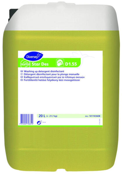 A Suma Star Des D1.55 folyékony fertőtlenítő tisztítószer koncentrátum, mely bármilyen felületet egy lépésben tisztít és fertőtlenít. A termék minden edény és eszköz fertőtlenítő hatású kézi mosogatására alkalmas, valamint alkalmazható élelmiszertároló helyiségekben történő felülettisztításra is.