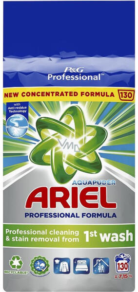 Az Ariel Professional mosópor fehér ruházatra, professzionális felhasználásra lett kifejlesztve. Tökéletesen tisztít és eltávolítja a professzionális létesítményekben előforduló foltokat. Úgy tervezték, hogy az első mosás során kiváló eredményeket érjen el áztatás vagy előmosás nélkül. Több mosás után is megőrzi a ruhák fehérségét és kellemes, friss illatot biztosít. Hatékony már 20°C -os mosásnál is. Foszfátmentes. Használata javasolt: