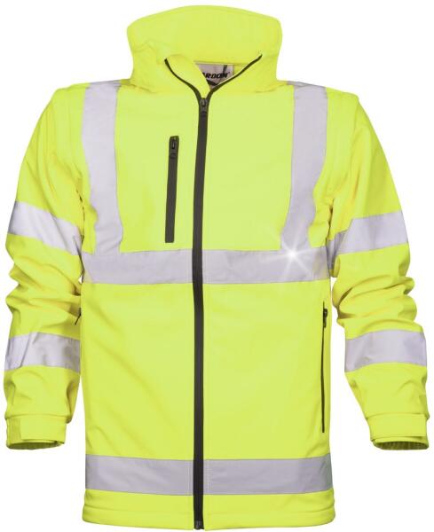 Stílusos fényvisszaverő softshell kabát 2 az 1-ben. Leszerelhető ujjakkal és kapucnival, vízálló és légáteresztő anyagból, vízálló cipzárral, mellkasi zsebbel és két cipzáras alsó zsebbel, fényvisszaverő elemekkel az EN 20471 szabvány szerint (3. osztály). Súlya 150 g/m2,   S-XXXL méretekben elérhető. Kerékpárhoz és motorkerékpárhoz is ideális.
