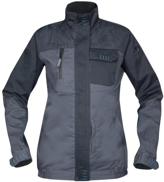 Női munkavédelmi felső, sportos kialakításban, amely tökéletesen követi a test alakját. Kényelmes anyagból készül, 240 g/m2 súllyal. 600D poliészterrel van megerősítve és kontrasztos színű varrással készül. Két mellkasi zsebbel és két alsó zsebbel, cipzáras zsebbel, fordított cipzárral és finom türkiz kiegészítőkkel rendelkezik. Az alsó oldalán gumival van kiegészítve, hogy jobban illeszkedjen a testhez. A mandzsettája tépőzárral állítható. Fel van szerelve fényvisszaverő elemekkel is a jobb láthatóság érdekében. Kétféle színben kapható - kék és szürke, valamint 38-58 méretben elérhető.