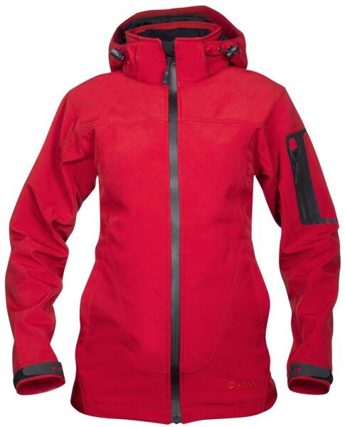 Női softshell kabát levehető kapucnival, modern szabással. Alul és a kapucninál húzózsinórral, 2 cipzáras oldalsó zsebbel, állítható mandzsettával, vízálló cipzárral rendelkezik. Vízálló 10000 mm-ig, MVp 800 g/m2/24h.