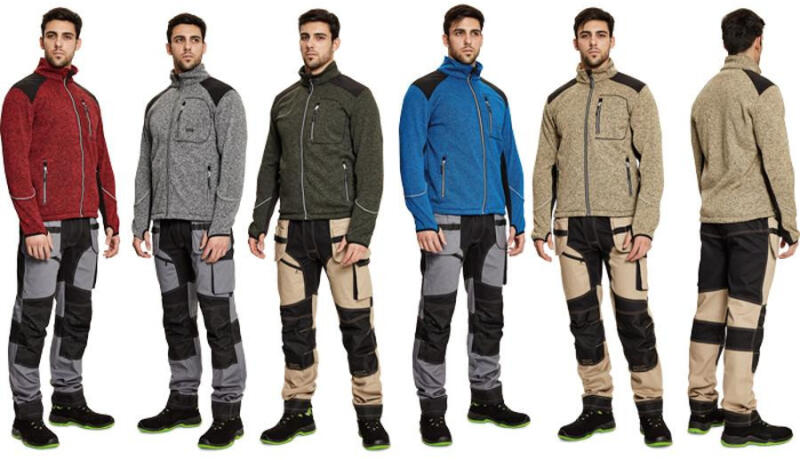 csíkos kötésű férfi teljes hosszúságú pulóver belül fésült; megerősített rész a vállak és az ujjak területén kontrasztos színű sofshell anyaggal; 1 cipzáras mellzseb; 2 oldalsó cipzáras zseb; állítható alsó kerületi szélesség; dekoratív fényvisszaverő díszítés az ujján, fűzőlyuk a hüvelykujjon
