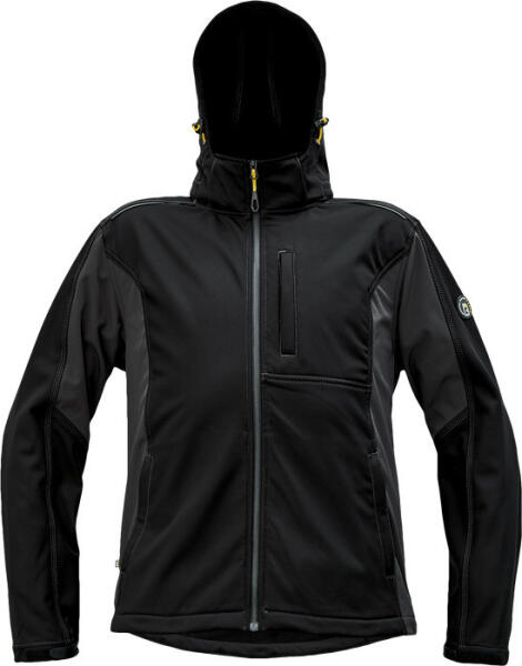 férfi softshell kabát, ergonomikus szabású, levehető kapucni, 3 elülső cipzáras zseb, 2 belső zseb, fényvisszaverő elemek színben, állítható ujjszélesség műanyag tépőzárral, alsó kerületén húzózsinór fékkel