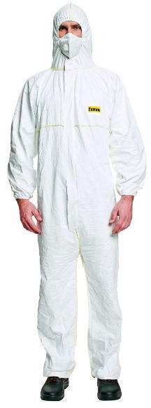 JELLEMZŐ ALKALMAZÁSI TERÜLETEK: A ČERVA védőruha, a DuPont CHF5CB modell, célja, hogy megvédje a munkavállalókat a veszélyes anyagoktól, vagy megvédje az érzékeny termékeket az emberi szennyeződéstől, a vegyi toxicitástól és az expozíciós körülményektől függően. Szemcsék (5. típus) és alacsony folyadéktartalmú permetezés (6. típus) elleni védelemhez. Anyaga: 100% nem szőtt PE DuPont szövet