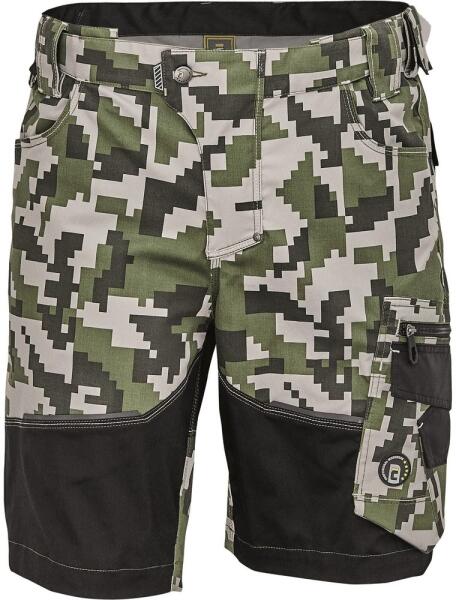 Férfi rövidnadrág geometrikus terepmintával, kiváló minőségű és innovatív TRIFIBETEX® rugalmas anyagból. Ez az ergonomikus illeszkedéssel és alacsonyabb rugalmas derékkal együtt garantálja a maximális kényelmet egész nap viselve is. Az ülőrész és a nadrág szára hármas varrással rendelkezik, eredeti rögzítés, és a színárnyalatban található fényvisszaverő elemeknek köszönhetően jobban látható lesz. Elöl tágas multifunkcionális zsebek szerszámhurokkal, a hátoldalon 2 tépőzáras zseb, tépőzáras combzseb okostelefonra, zseb mérőszalag és kés számára, kalapács hurok, "D" gyűrű és szerszámhurok.