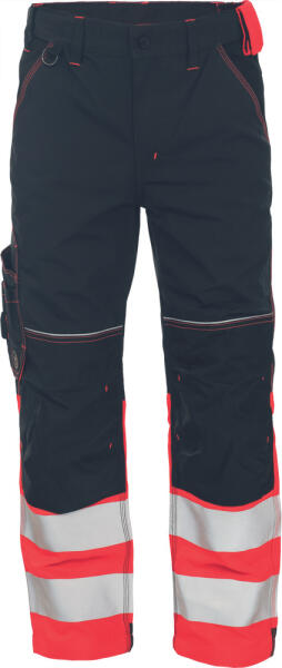férfi munkanadrág rugalmas derékkal, leengedhető szárakkal és 5 funkcionális zsebbel a nadrágszárakat HI-VIS anyaggal, és 2 nyomtatott fényvisszavető csíkkal kombináltuk megerősített térdrész és térdzseb Oxford 600D anyagból térdvédő behelyezéséhez dekoratív részletek és kontrasztos színű tűzések