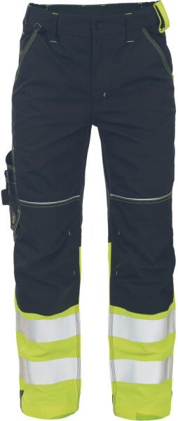 férfi munkanadrág rugalmas derékkal, leengedhető szárakkal és 5 funkcionális zsebbel a nadrágszárakat HI-VIS anyaggal, és 2 nyomtatott fényvisszavető csíkkal kombináltuk megerősített térdrész és térdzseb Oxford 600D anyagból térdvédő behelyezéséhez dekoratív részletek és kontrasztos színű tűzések