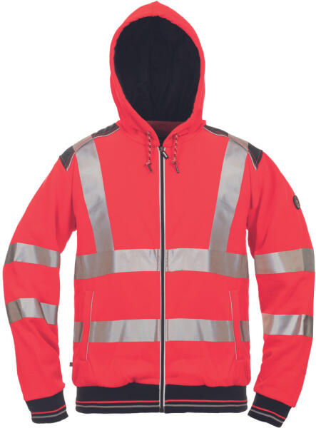 kevertszálas, jólláthatósági kapucnis kardigán cipzárral 2 db 5 cm-es szegmentált fényvisszavető csíkkal a derékrészen, az ujjakon és a vállakon bolyhosodásmentes francia frottír szövet belső, kétrétegű kapucni, dekoratív tűzések rugalmas mandzsetta és alsó szegély