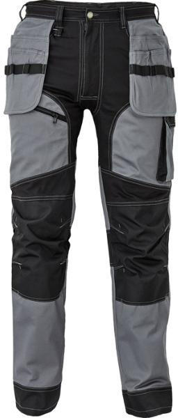 Férfi munkanadrág elasztikus anyagból; 2 oldalzseb és 2 behelyezhető többfunkciós szerszámzseb; "D" gyűrű; 1 oldalsó nadrágzseb sarokkal; 1 cipzáras nadrágzseb; 2 betöltött hátsó zseb lábbal; megerősített térdrész lehetőséggel; térdmerevítők behelyezése; nadrágfül, amely akár 5 cm-es hosszhosszabbítást tesz lehetővé; megerősített hátsó rész a nadrág alján; dekoratív varrás; 265 g / m2